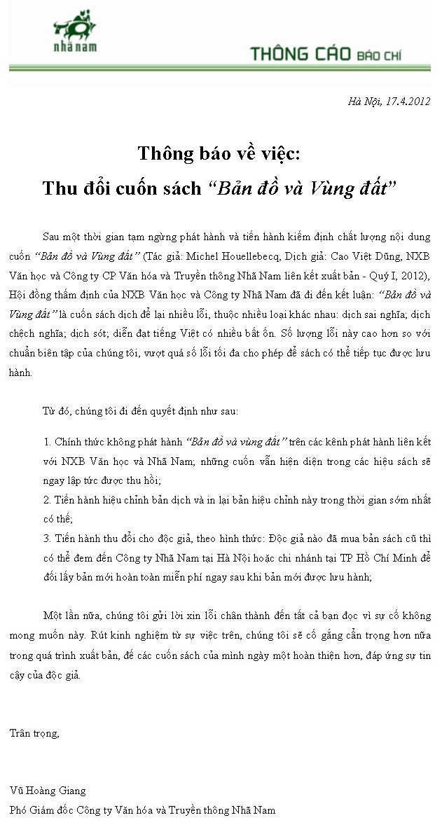 Chiều 17- 4, công ty văn hóa Nhã Nam đã gửi email tới các phóng viên báo đài về việc thu đổi cuốn sách Bản đồ và vùng đất. Nội dung như sau: