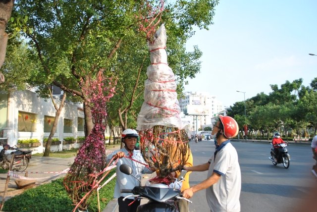những người buôn hoa đào từ các tỉnh phía Bắc vào TPHCM khi đến cuối buổi chiều