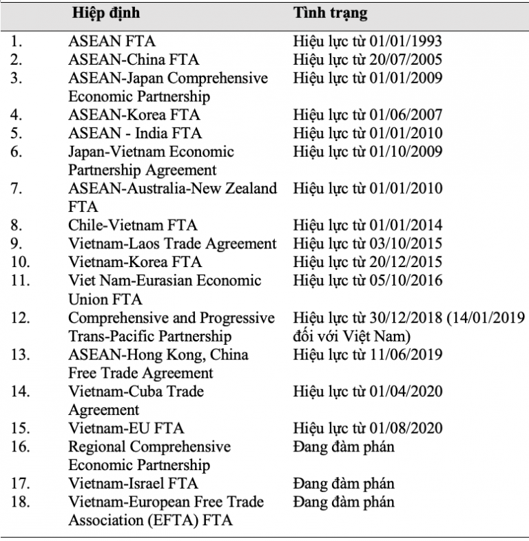 1: Danh sách và tình trạng các FTA của Việt Nam