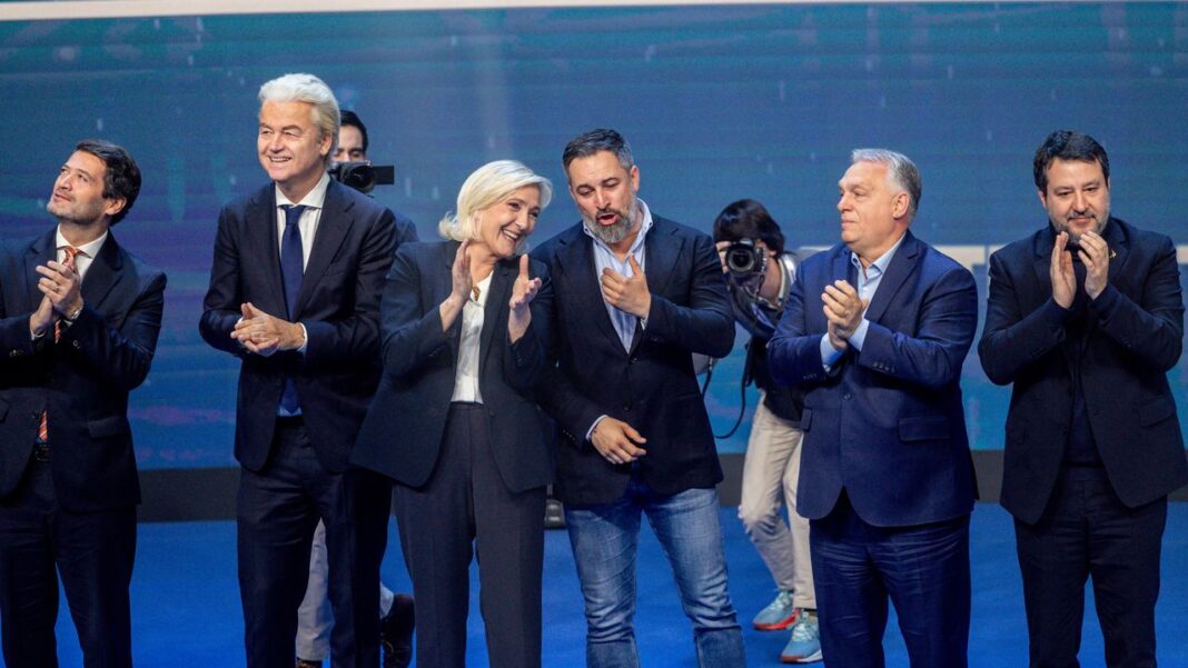 Từ trái sang phải: Lãnh đạo đảng chính trị cực hữu Chega của Bồ Đào Nha Andre Ventura; lãnh đạo cực hữu Hà Lan Geert Wilders; lãnh đạo cực hữu Pháp kiêm nghị sĩ quốc hội Marine Le Pen, Chủ tịch nhóm nghị sĩ đảng cực hữu Tập hợp Quốc gia (Rassemblement National – RN) của Pháp; lãnh đạo đảng cực hữu Vox của Tây Ban Nha Santiago Abascal; Thủ tướng Hungary Viktor Orbán và Phó Thủ tướng Ý Matteo Salvini đứng trên sân khấu tại cuộc biểu tình của đảng cực hữu VOX của Tây Ban Nha cùng với các nhà lãnh đạo cực hữu châu Âu khác, tại Madrid, Tây Ban Nha, ngày 8-2-2025. Nguồn: Eropa Press/ ABACA